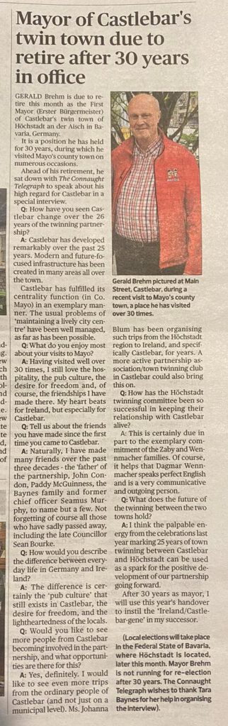 Während in Irland jedes Jahr ein anderes Mitglied des Town Council das Amt des Bürgermeisters übernimmt, kannten die Castlebarer drei Jahrzehnte lang nur einen Höchstadter Bürgermeister, nämlich Gerald Brehm. Mit den Kommunalwahlen am 8. März 2026 wird es nun einen Wechsel beim Höchstadter Rathauschef geben. Vom Connaught Telegraph wurde aus diesem Anlass der scheidende Bürgermeister Gerald Brehm interviewt.